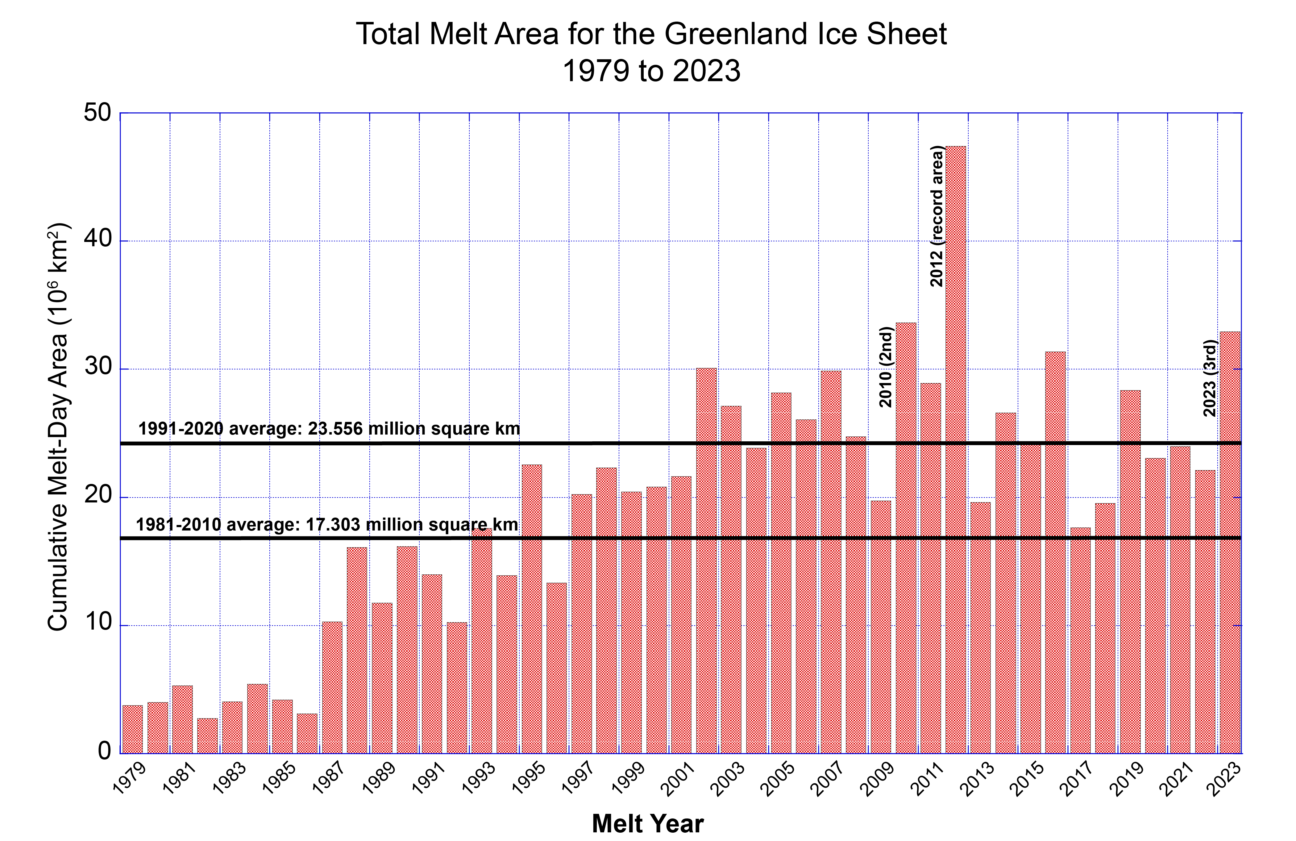 Abb. 1: Zeitliche Entwicklung der schmelzenden Flächen des grönländischen Eisschildes. Seit den 1980er-Jahren ist ein eindeutiger Trend in Richtung Ausdehnung jener Flächen, die oberflächlich schmelzen, erkennbar. Seit dem Jahr 2012 ist das Abschmelzen des grönländischen Eisschilds unterschiedlich stark, liegt aber im Allgemeinen immer noch über den Werten der 1980er und 1990er Jahre (T. Scambos, Cooperative Institute for Research in Environmental Sciences (CIRES), and NSIDC 2024).